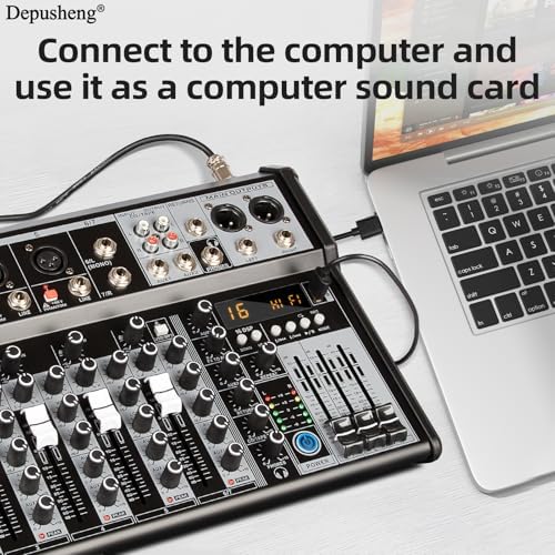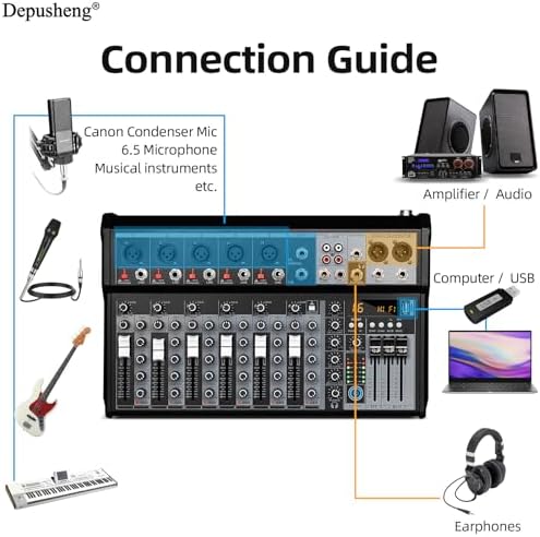 Elevate your audio experience with the Depusheng Professional Audio Mixer, a powerful 7-channel audio interface designed for versatility and performance. Perfect for DJs, musicians, and podcasters, this mixing console system combines state-of-the-art technology with user-friendly features, making it ideal for karaoke, studio recordings, live streaming, and more.